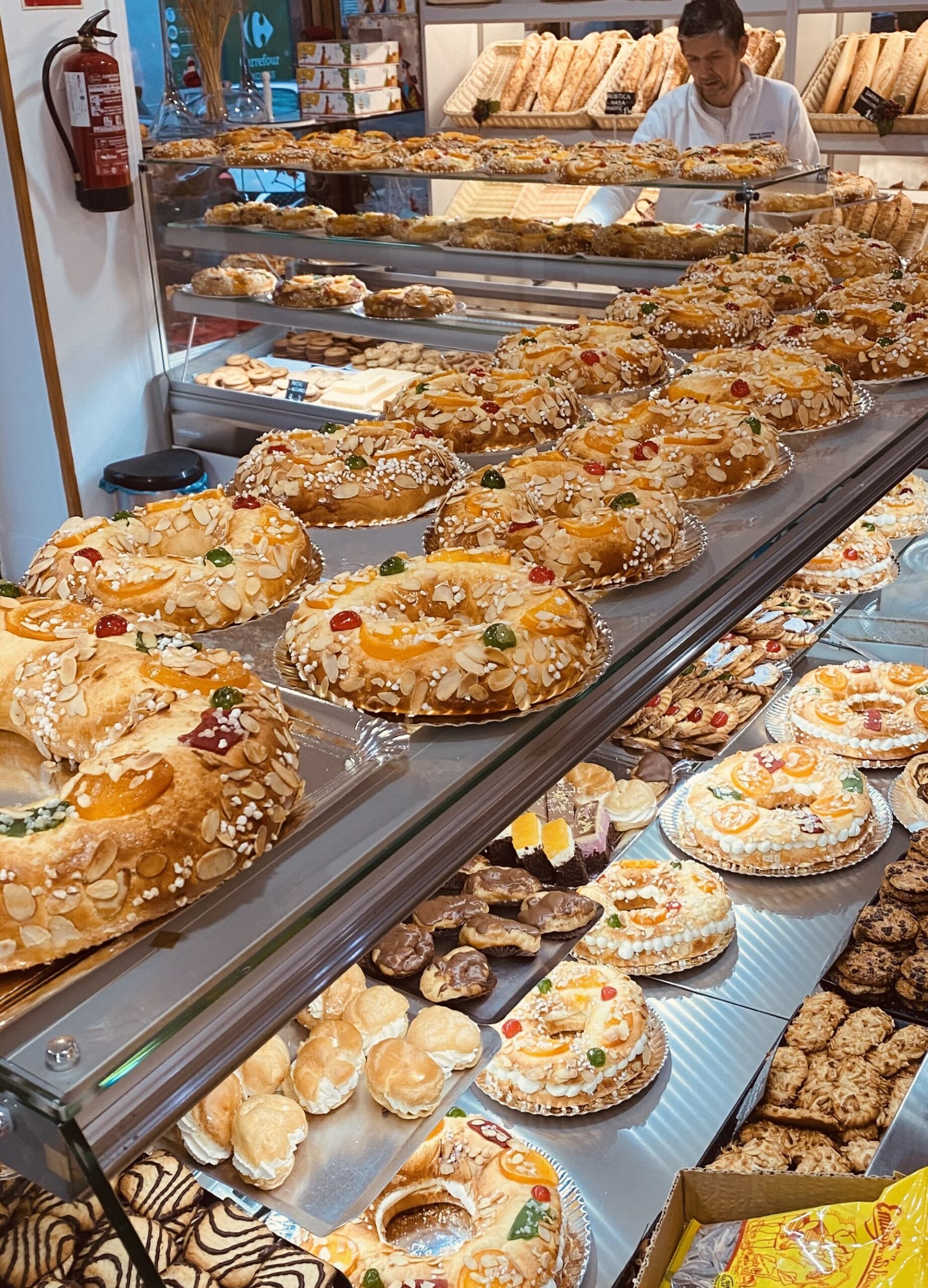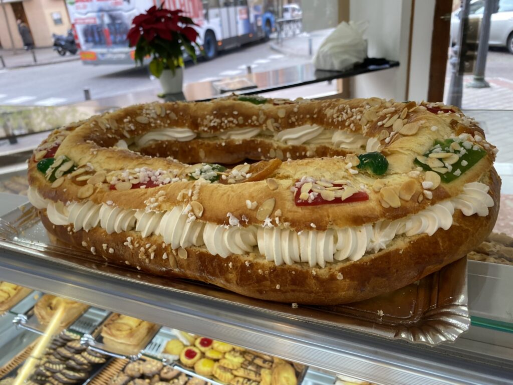 Por fuera, es un arcoíris de colores gracias a las frutas escarchadas (las «joyas» de la corona) y el azúcar crujiente. Si tiene relleno, suele ser de una capa generosa de nata montada que lo hace suave y cremoso por dentro.